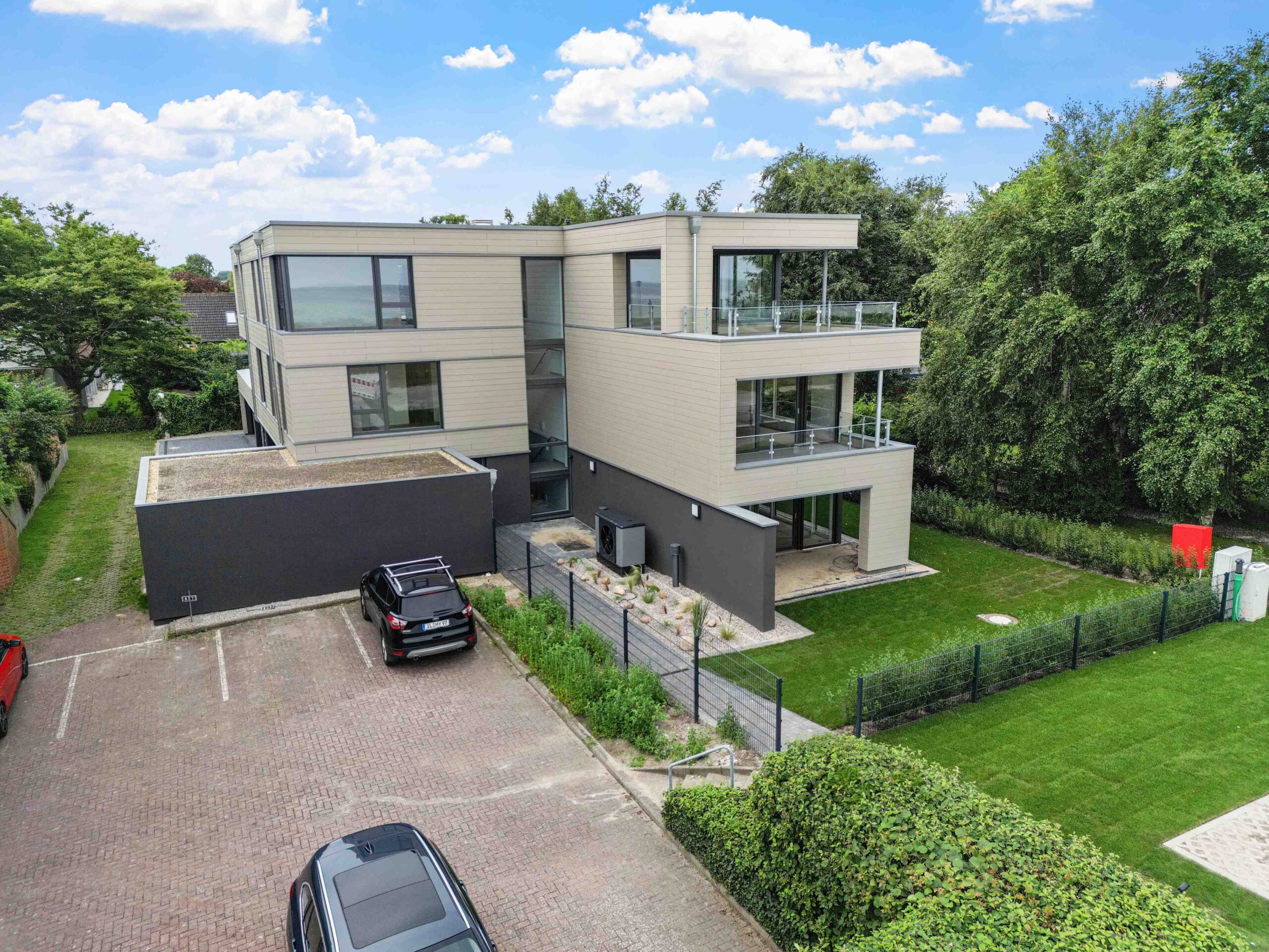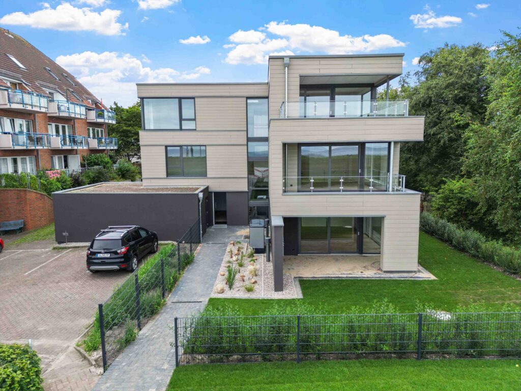 Die Außenanlagen sind liebevoll gestaltet: begrünte Gemeinschaftsflächen mit Rasen, Hecken und Solitärgehölzen, ein gepflasterter Zufahrts- und Rangierbereich sowie kurze Wege zu den Stellplätzen und direkt zur Promenade. So fügt sich das Gebäude harmonisch in die Umgebung ein und unterstreicht seine Wertigkeit auf