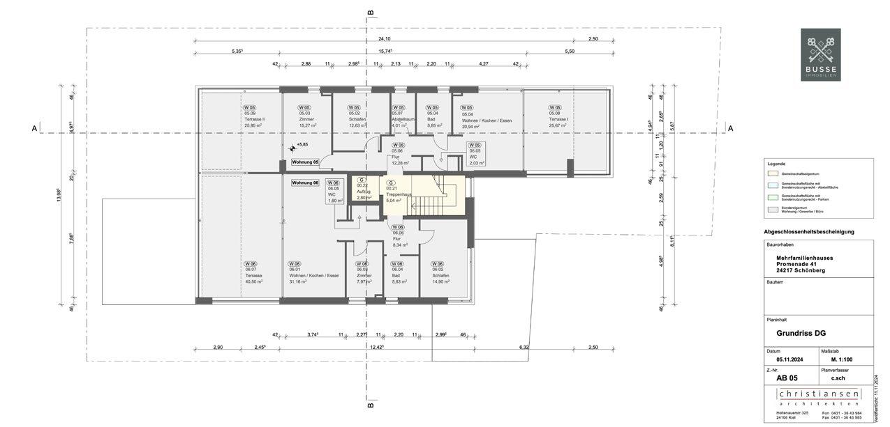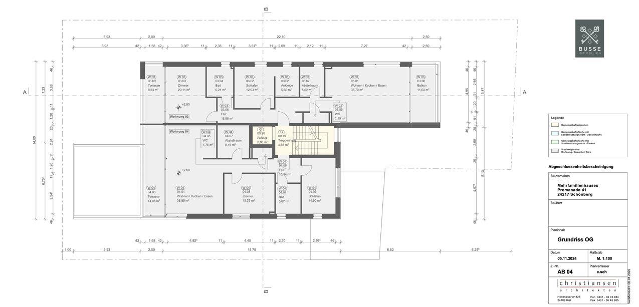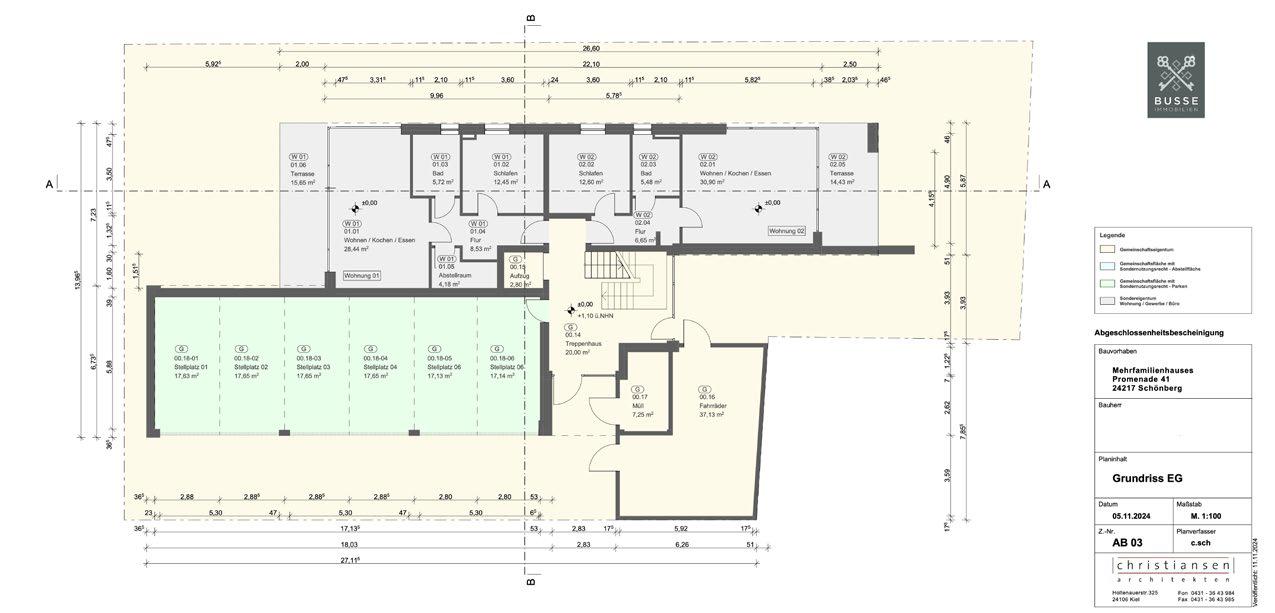Die Eigentumswohnanlage befindet sich auf einem ca. 760 qm großen Grundstück in allerbester Lage direkt an der Strandpromenade. Das Gebäude umfasst ein unter kellertes Wohnhaus mit zwei Vollgeschossen und einem Staffelgeschoss sowie eine integrierte Garage mit sechs überdachten Stellplätzen.
