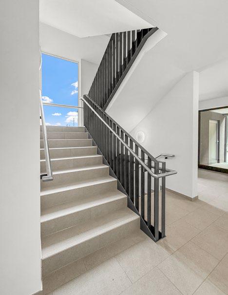 Alle Wohnungen sind barrierefrei zugänglich. Das zentrale Treppenhaus ist mit einem Aufzug erschlossen, der ebenerdig erreichbar ist. Breite Flure, schwellenlose Türen, großzügige Bewegungsflächen und bodengleiche Duschen sorgen für Komfort und Zukunftssicherheit. Jede Wohnung verfügt über einen eigenen Kellerraum, zudem stehen Abstellmöglichkeiten für Fahrräder in einem eigens errichteten Holzfach