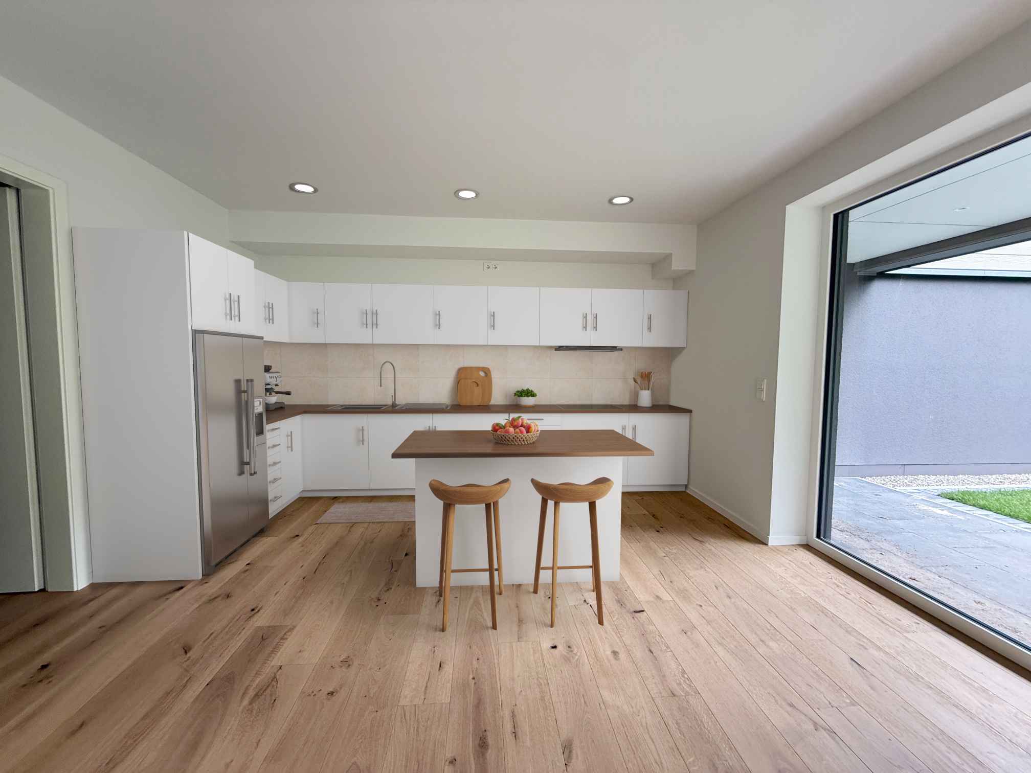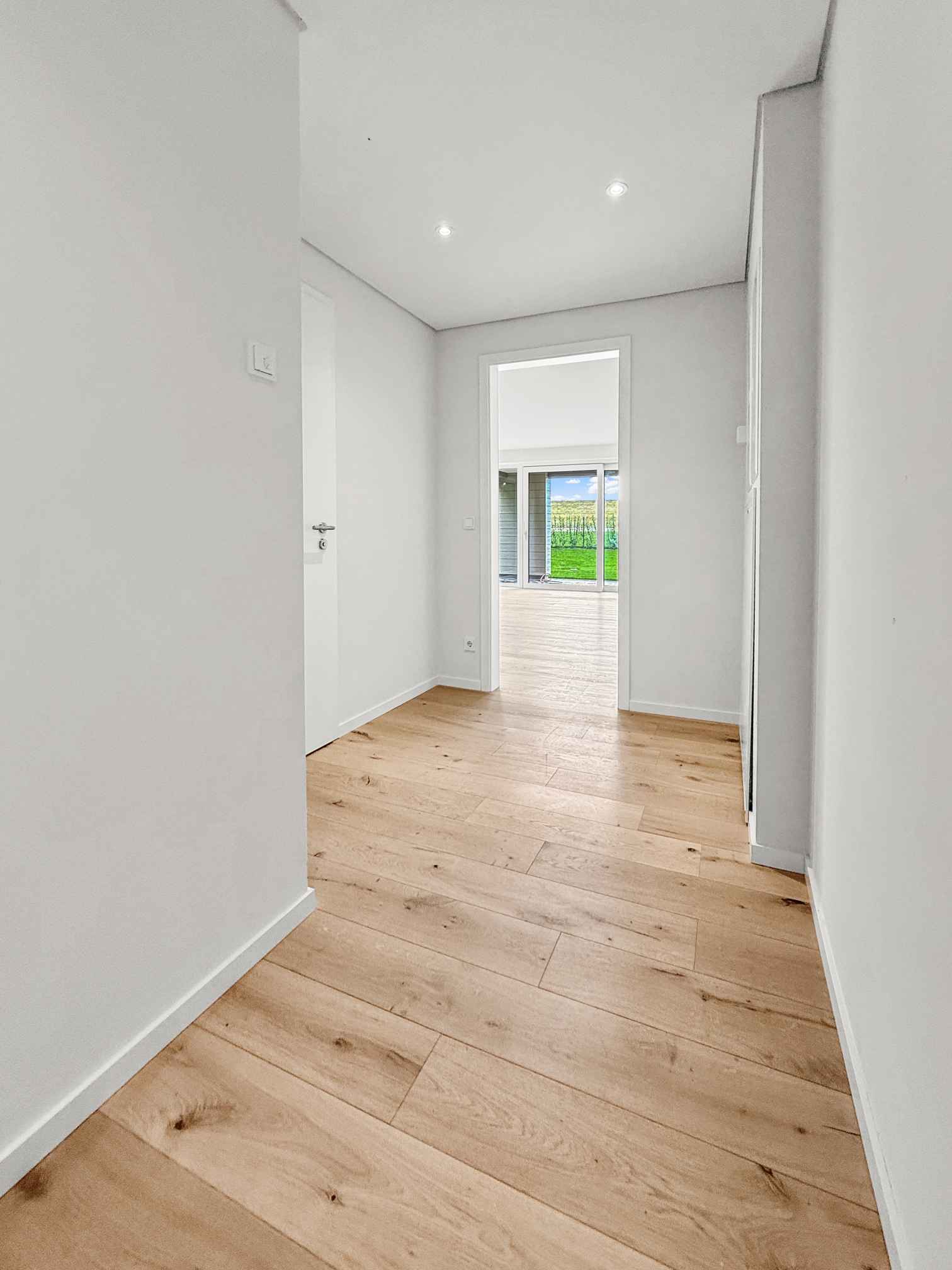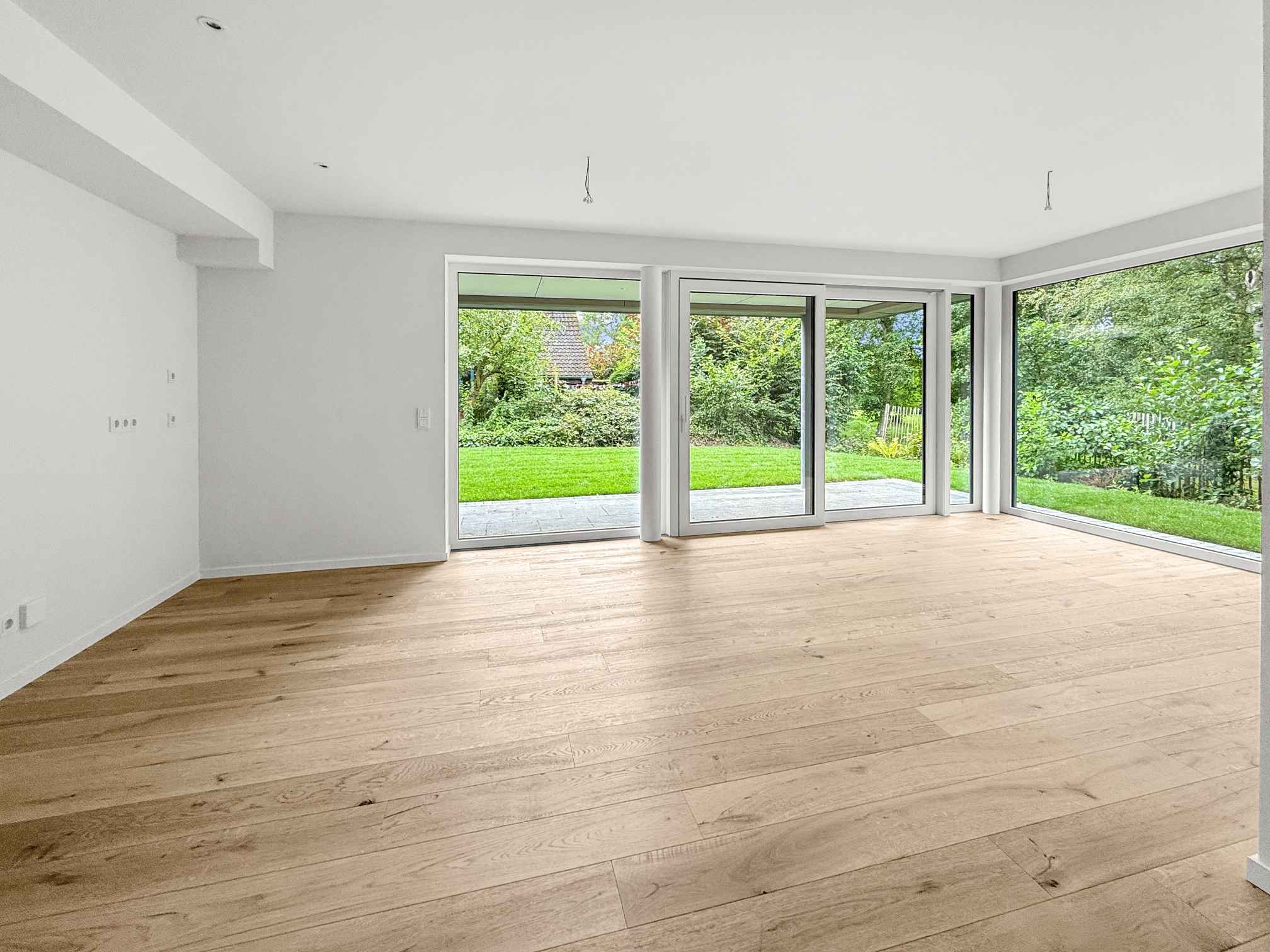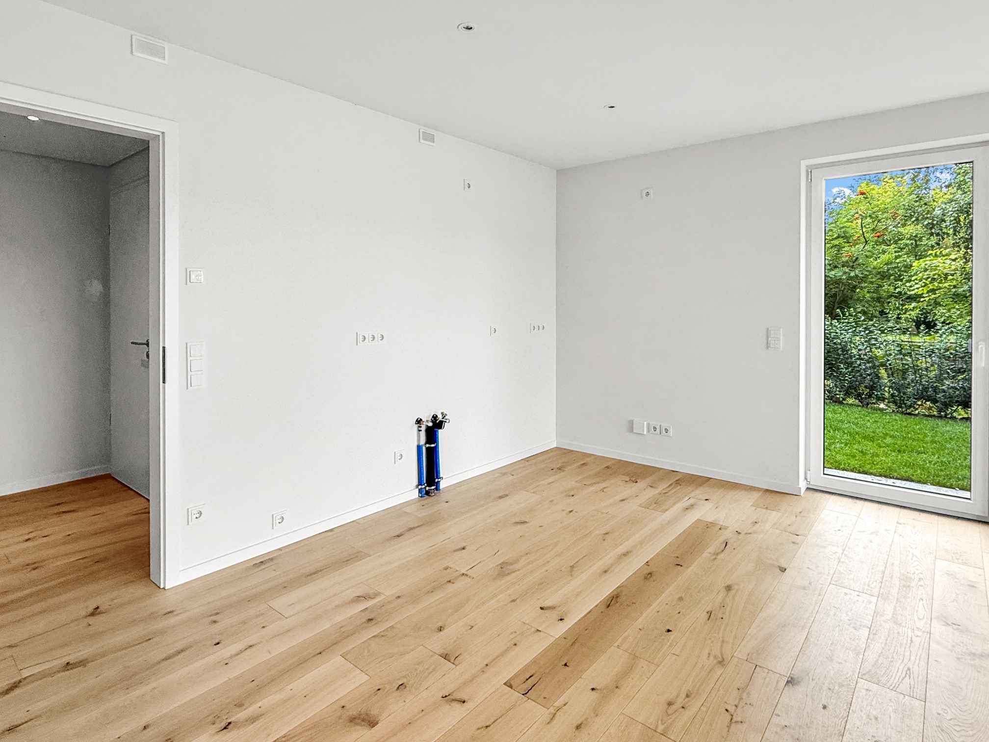 Die Eingangstür, die Visitenkarte einer jeden Wohnung, ist einladend und beschützend zugleich, hier als weiße Innentür dicht- und selbstschließend ausgeführt. Über die Diele sind alle Räume zugänglich, wie der mit knapp 30 m² sehr großzügige, helle Wohn- und Essbereich mit einer integrierten offenen Küche. Die Installation der Küche kann individuell gestaltet werden und obliegt dem Eigentümer. Alle erforderlichen Leitungen (Sanitär und Elektro) bis zu den senkrechten Ver- und Entsorgungsschächten sind vorhanden.