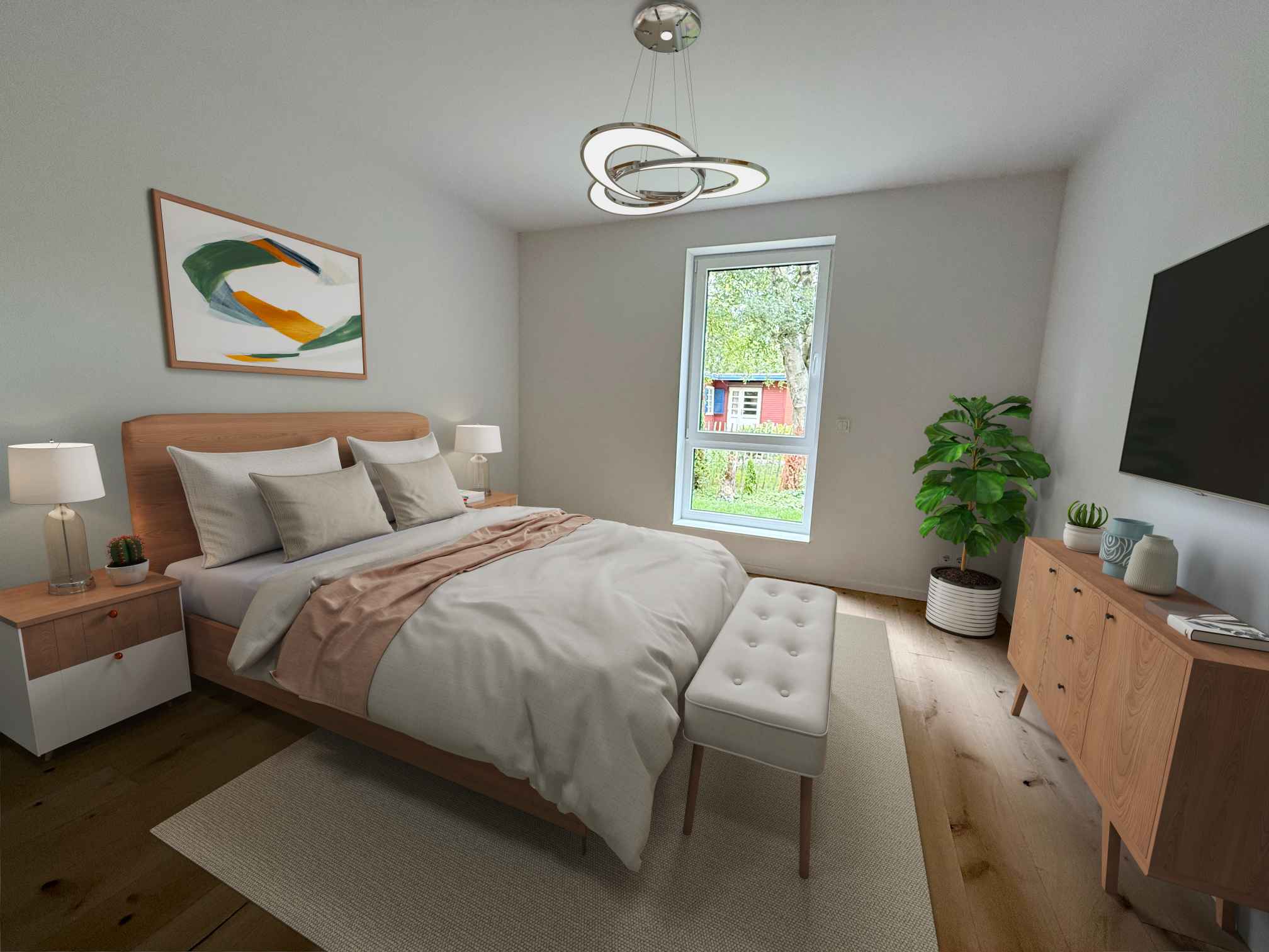 Der lichtdurchflutete offene Wohn-/Ess-/Kochbereich übernimmt die Tradition des in skandinavischen Ländern so beliebten Allraums, der das gemeinschaftliche Leben ohne trennende Wände ermöglicht und für hohe Lebensqualität, Entspannung und Wohlbefinden sorgt. Das mit 12,5 m² gut bemessene Schlafzimmer ist wie alle Räume, mit Ausnahme des Badezimmers und des Abstellraumes, mit schönem Parkettboden aus Eiche, inkl. weißen Fußleisten aus Holz versehen. Die gesamte Wohnung ist barrierefrei.