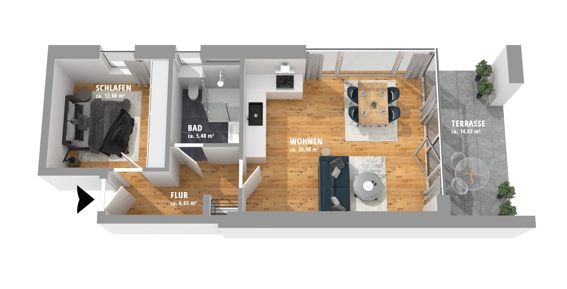Die Eingangstür, die Visitenkarte einer jeden Wohnung, ist einladend und beschützend zugleich, hier als weiße Innentür dicht- und selbstschließend ausgeführt. Über die Diele sind alle Räume zugänglich, wie der mit knapp 31 m² sehr großzügige, helle Wohn- und Essbereich mit einer integrierten offenen Küche. Die Installation der Küche kann individuell gestaltet werden und obliegt dem Eigentümer. Alle erforderlichen Leitungen (Sanitär und Elektro) bis zu den senkrechten Ver- und Entsorgungsschächten sind vorhanden.
