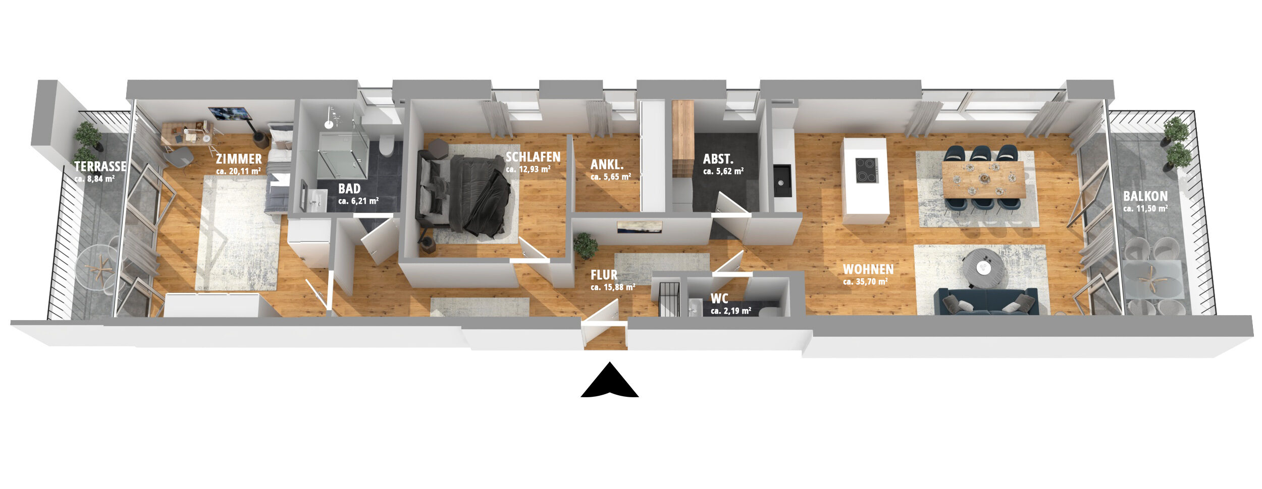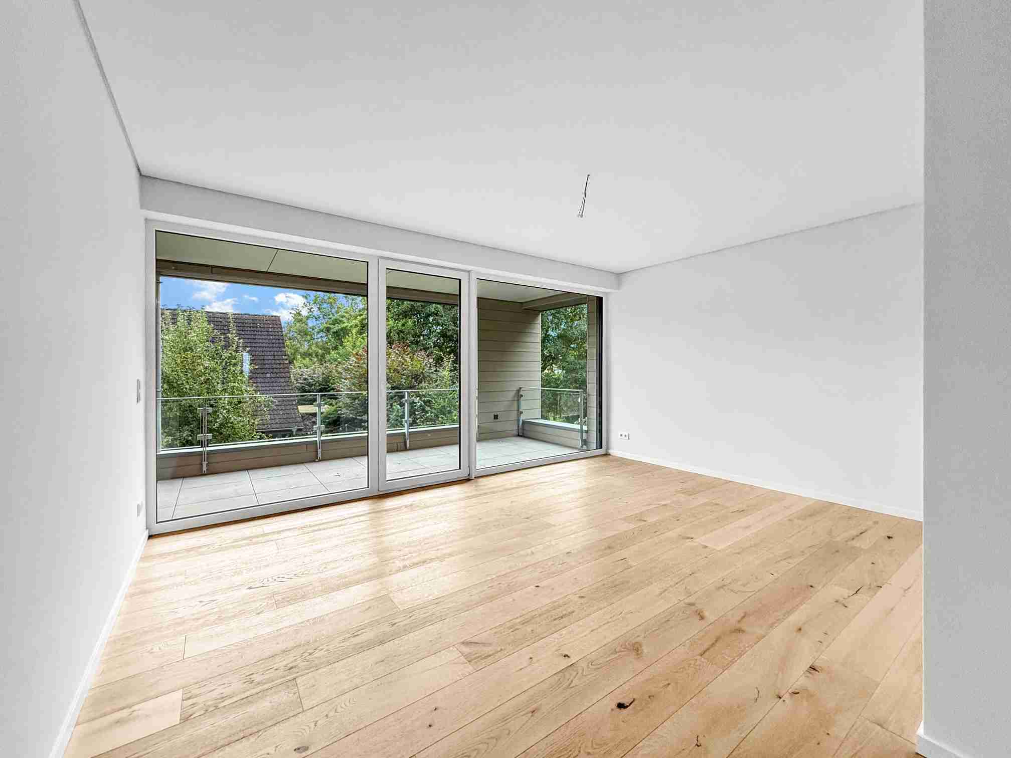 Das rund 13 m² große Schlafzimmer wird durch einen ca. 6 m² großen Ankleidebereich ergänzt und bietet damit viel Raum für Komfort und Stauraum – ein echtes Plus an Wohnqualität. Ein weiteres Highlight ist das zweite Zimmer mit ca. 20 m², das dank vorgelagerter Balkonterrasse in Südlage eröffnet und sich perfekt als Gästezimmer, 2. Schlafzimmer, Büro oder privater Rückzugsort eignet. Ergänzt wird das Raumangebot durch einen praktischen Hauswirtschaftsraum mit ca. 6 m², der Ordnung und Funktionalität sicherstellt. Das elegante Badezimmer mit ca. 6,2 m² verbindet Komfort und modernes Design und wird durch ein separates Gäste-WC ideal ergänzt – perfekt für Paare, Familien und Gäste. Alle Räume, mit Ausnahme des Badezimmers und des Abstellraumes, mit schönem Parkettboden aus Eiche, inkl. weißen Fußleisten aus Holz versehen. Die gesamte Wohnung ist barrierefrei.