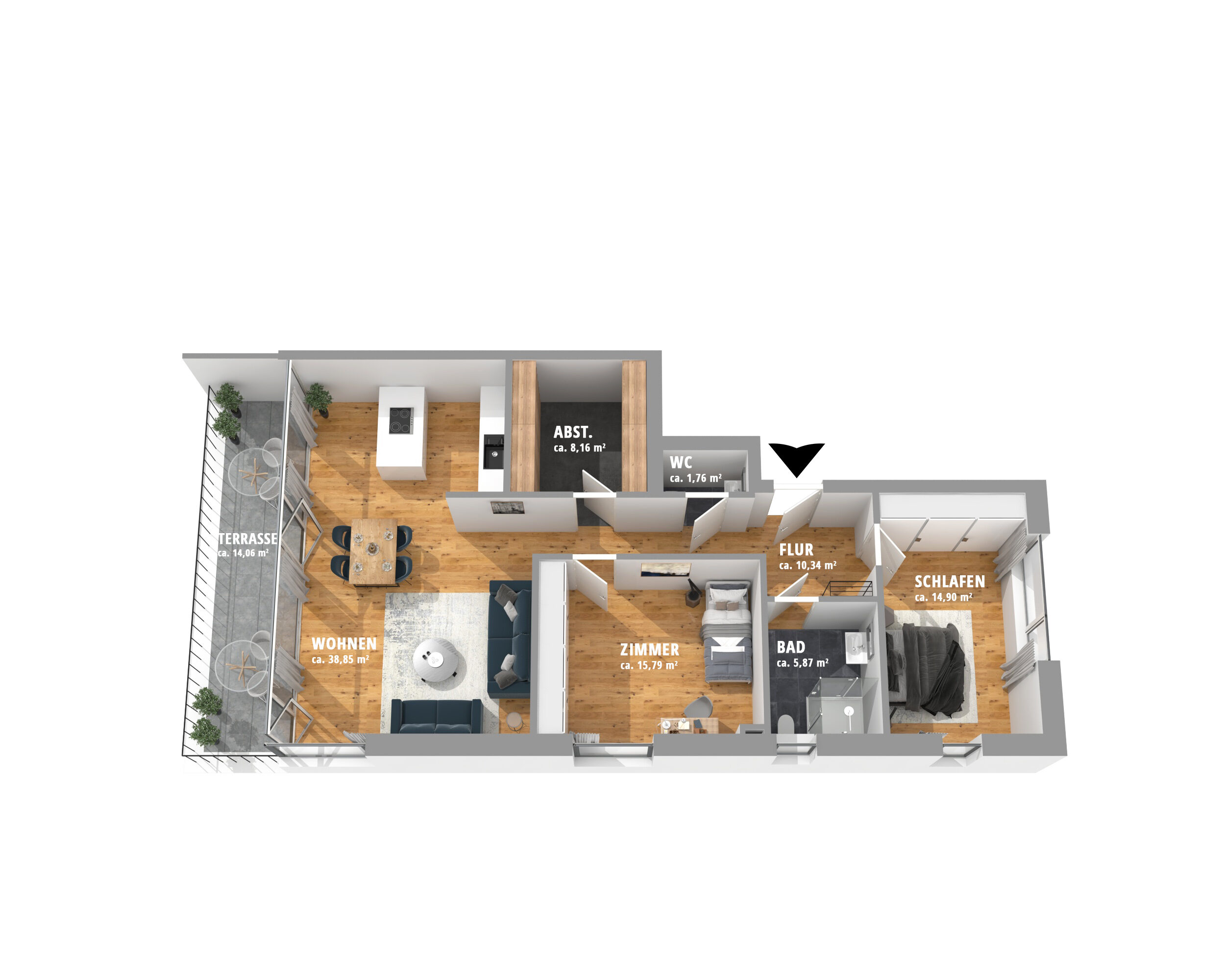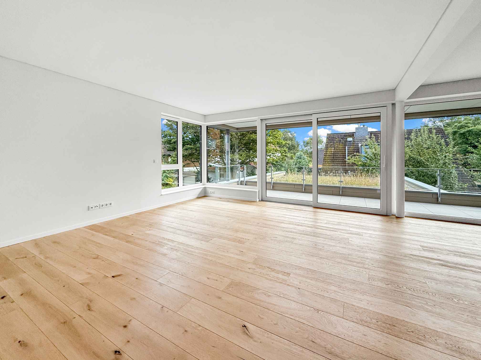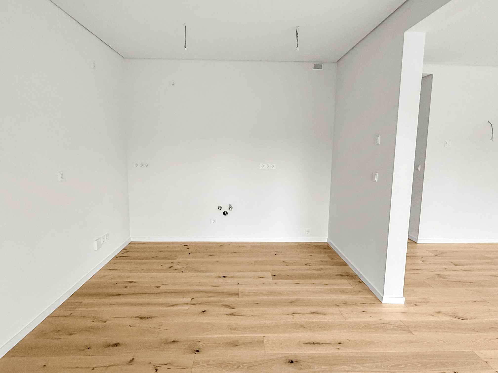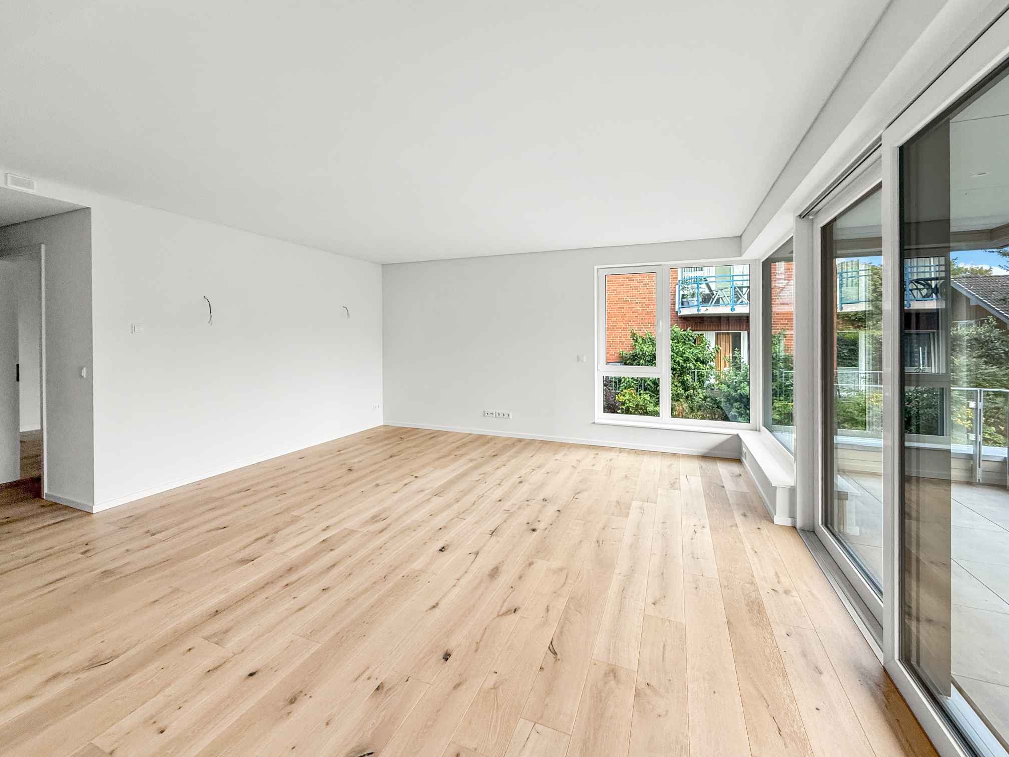 Der rund 10 m² große Flur öffnet den Zugang zu allen Bereichen und führt direkt in den ca. 39 m² umfassenden Wohn- und Essbereich. Dieser lichtdurchflutete Mittelpunkt der Wohnung mit offener Küche (Leitungen vorbereitet) geht nahtlos in die ca. 14 m² große SüdPanoramaterrasse über – ein Platz, der gleichermaßen zum Sonnen, Entspannen und gemeinsamen Genießen einlädt.