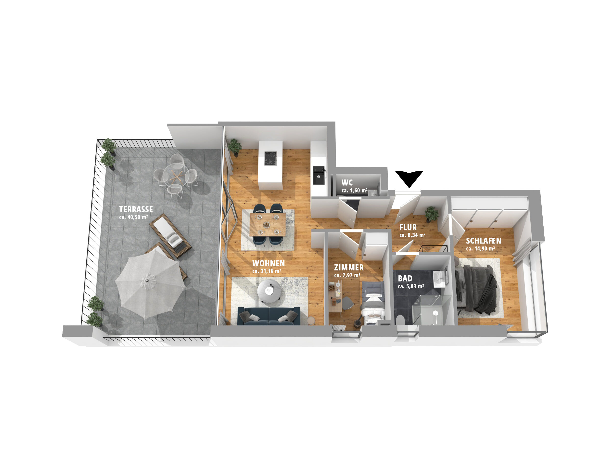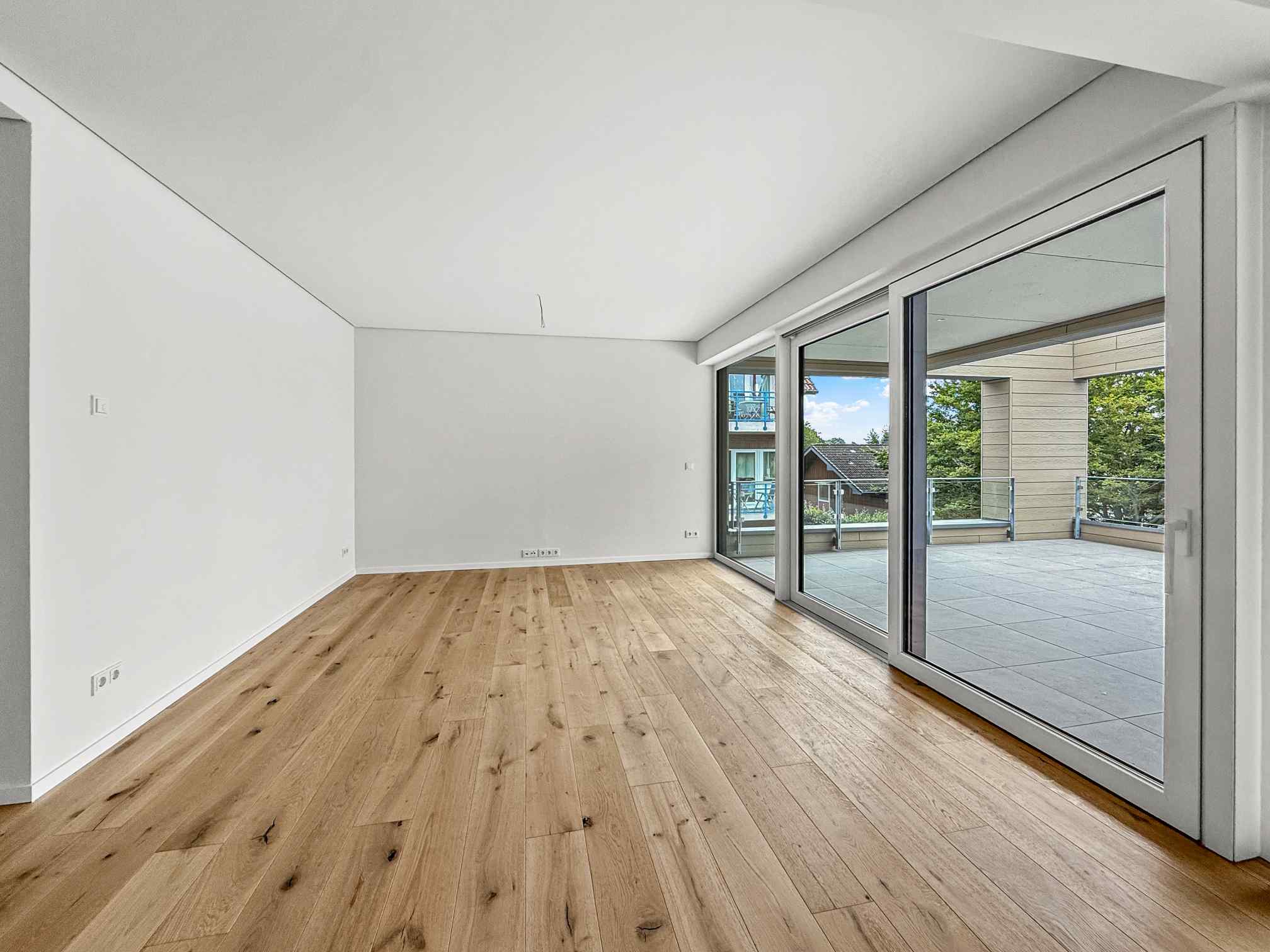 Das Herzstück ist der ca. 31 m² große Wohn- und Essbereich mit offener Küche (Leitungen vorbereitet), der mit Helligkeit und Weite überzeugt. Von hier aus gelangen Sie auf die über 40 m² große, sonnenverwöhnte Panorama-Südterrasse – Ihr privates Paradies zum Entspannen, Sonnen und Genießen.