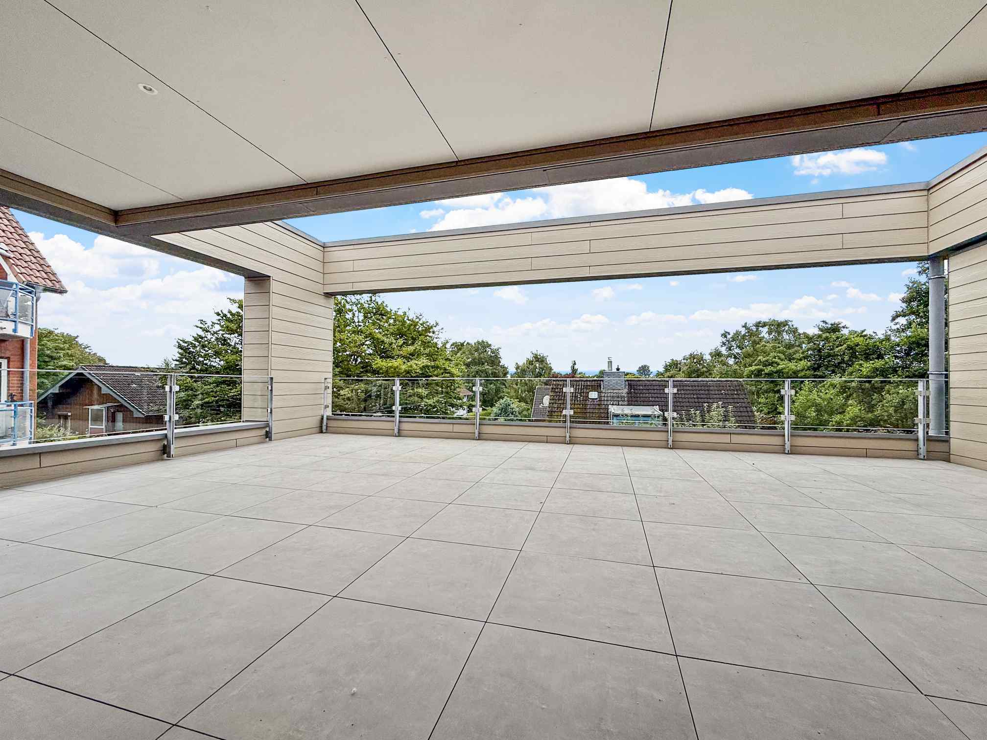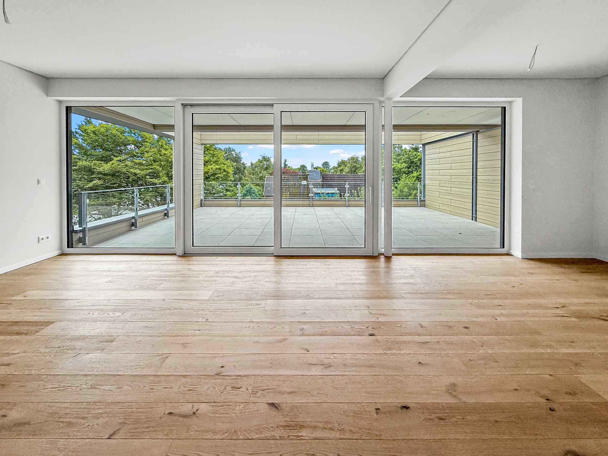 40 qm große Panorama-Südterrasse und Meerblick direkt aus dem Schlafzimmer